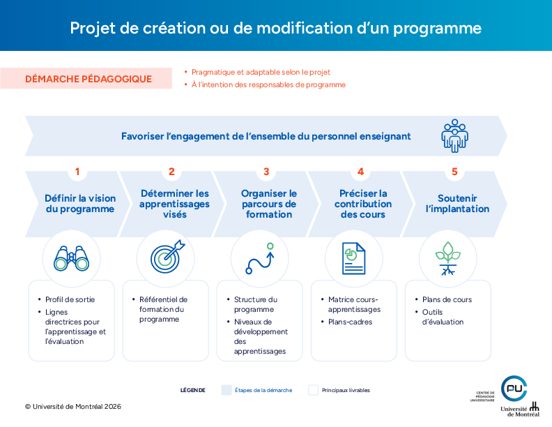 Le Centre de pédagogie universitaire (CPU) peut accompagner les responsables de programme, soutenus par leur direction, dans la conduite d’un projet de création ou de révision de programme et dans la gestion du changement pédagogique auprès du personnel enseignant (voir compétences C9 et C10 de ce référentiel). Pour ce faire, le CPU a développé une démarche en six étapes menant à l’implantation du projet selon une approche participative et collaborative. Cette démarche est adaptable selon le contexte du programme, l’ampleur de son projet, ses intentions de changement et les ressources dont il dispose.